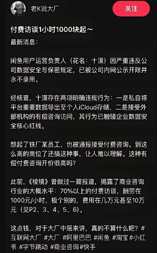 据相关爆料人士,公告内容显示,经核查,闲鱼用户运营负责人十漠,存在两项违规行为:一是,私自将平台重要数据导出至iCloud存储,二是,接受接受外部机构的有偿咨询访问,其行为已触碰企业数据安全核心红线。